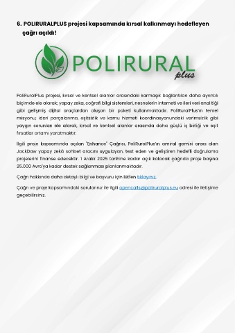 Çağrı ve proje kapsamındaki sorularınız ile ilgili opencalls@poliruralplus.eu adresi ile iletişime