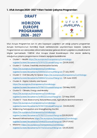 1. Ufuk Avrupa 2026-2027 Yılları Taslak Çalışma Programları