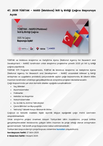 47. 2530 TÜBİTAK – NARD (Moldova) İkili İş Birliği Çağrısı Başvuruya