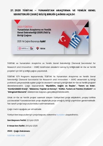 27. 2520 TÜBİTAK – YUNANİSTAN ARAŞTIRMA VE YENİLİK GENEL