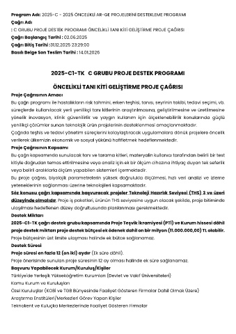 : C GRUBU PROJE DESTEK PROGRAMI ÖNCELİKLİ TANI KİTİ GELİŞTİRME PROJE ÇAĞRISI