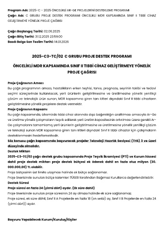 Çağrı Adı: C GRUBU PROJE DESTEK PROGRAMI ÖNCELİKLİ MDR KAPSAMINDA SINIF II TIBBİ CİHAZ