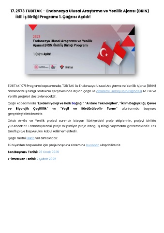17. 2573 TÜBİTAK – Endonezya Ulusal Araştırma ve Yenilik Ajansı (BRIN)