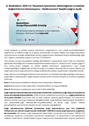 21. BiodivERsA+ 2025 Yılı "Ekosistem İşlevlerinin, Bütünlüğünün ve Habitat