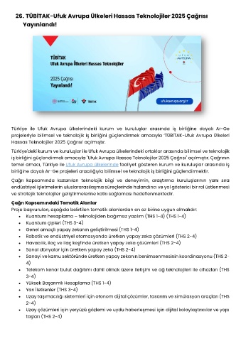 26. TÜBİTAK-Ufuk Avrupa Ülkeleri Hassas Teknolojiler 2025 Çağrısı
