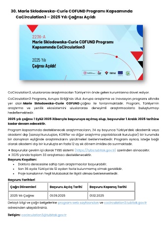 30. Marie Skłodowska-Curie COFUND Programı Kapsamında