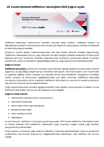 45. Eureka Network Hafifletme Teknolojileri 2025 Çağrısı Açıldı