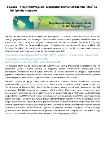 Programı” ve “2526 - Ar-Ge ve Yenilik Projeleri - Moğolistan Bilimler Akademisi (MAS) ile İkili İşbirliği